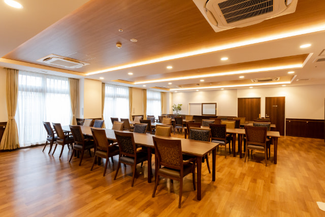 皆と一緒でのお食事は楽しいひととき。食事時間以外は,ご入居者さま同士や来訪者さまとの団らんにも使用いただけます。