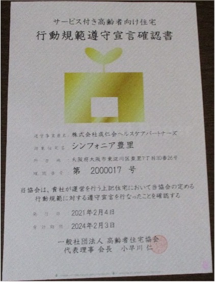 私どもは,(一社)高齢者住宅協会の会員であり,同協会が定めるサ-ビス付き高齢者向け住宅を運営する事業者が守るべき行動規範を遵守することを宣言いたしました。